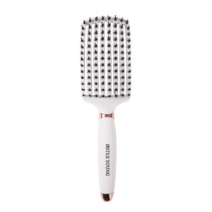 MIĘKKIE WŁOSIE DZIKA I ANTYSTATYCZNE NYLONOWE SZPILKI umożliwiają delikatne rozczesywanie i wygładzanie włosów bez ryzyka ich łamliwości lub uszkodzeń. Naturalne włosie dzika pomaga w redystrybucji naturalnych olejów z Twojej skóry głowy do włosów, zapewniając im zdrowy i błyszczący wygląd.